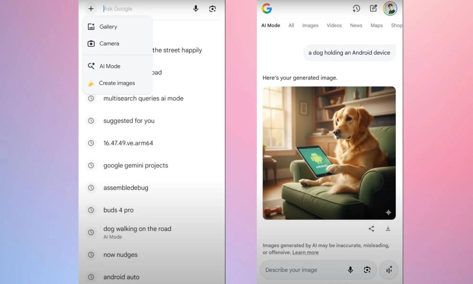 وكشفت عمليات تحليل تطبيق Google APK عن وجود خيار جديد باسم "إنشاء الصور"، ضمن أيقونة الإضافة (+) في شريط البحث، مما يمكّن المستخدم من توليد صور مبتكرة وفنية، دون الحاجة للانتقال إلى أدوات خارجية أو تطبيقات مستقلة.