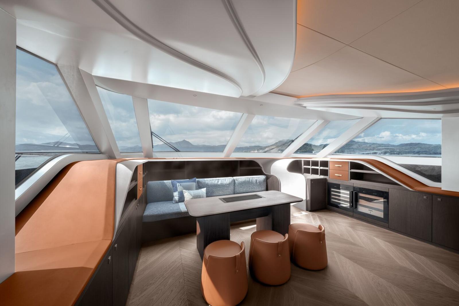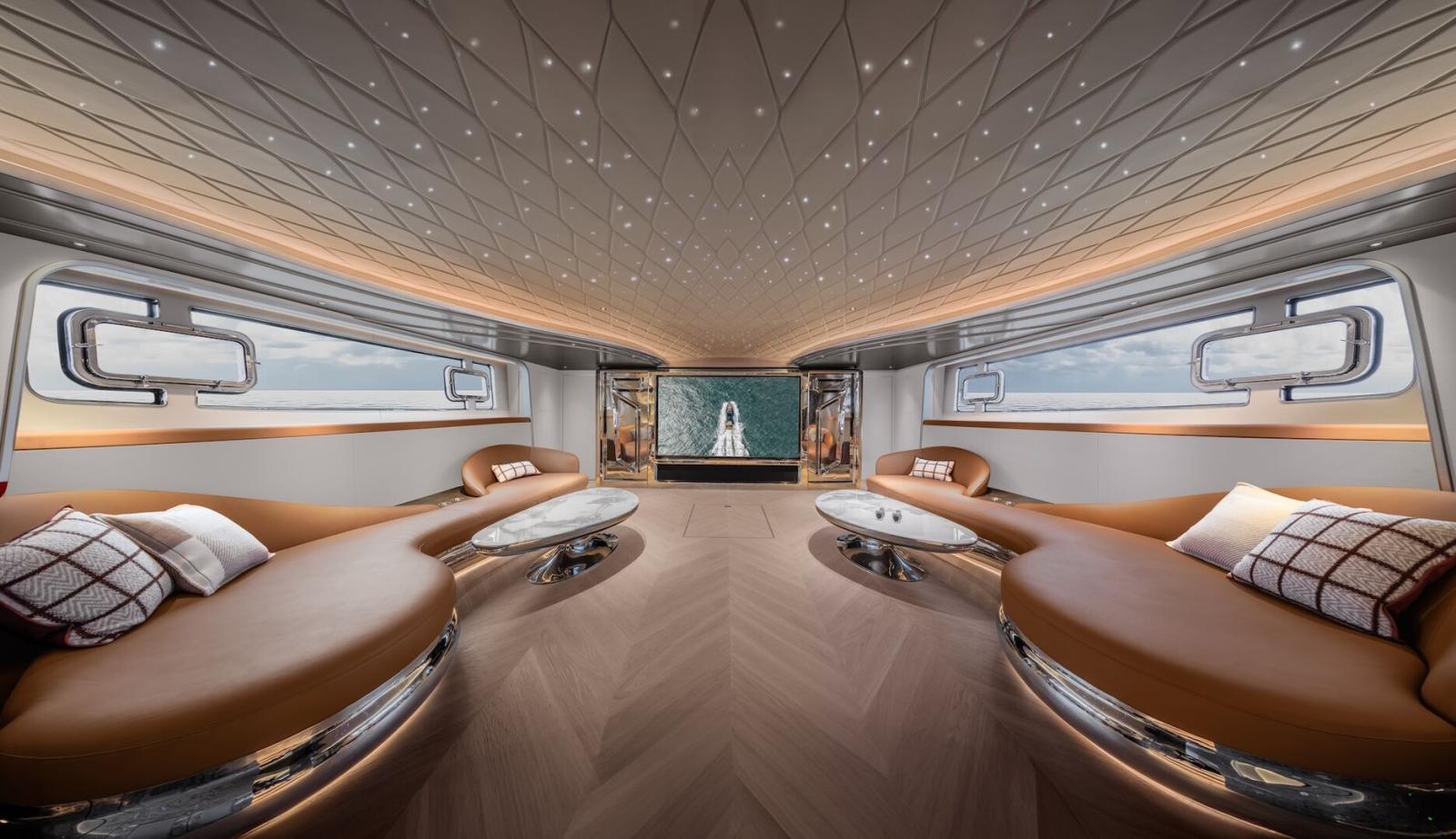 وتُعد الصالة الرئيسية في السطح العلوي القلب الاجتماعي لليخت، حيث تمزج الأناقة بالدفء، وتمنح الضيوف مساحة للتأمل وتبادل اللحظات في حضن البحر.