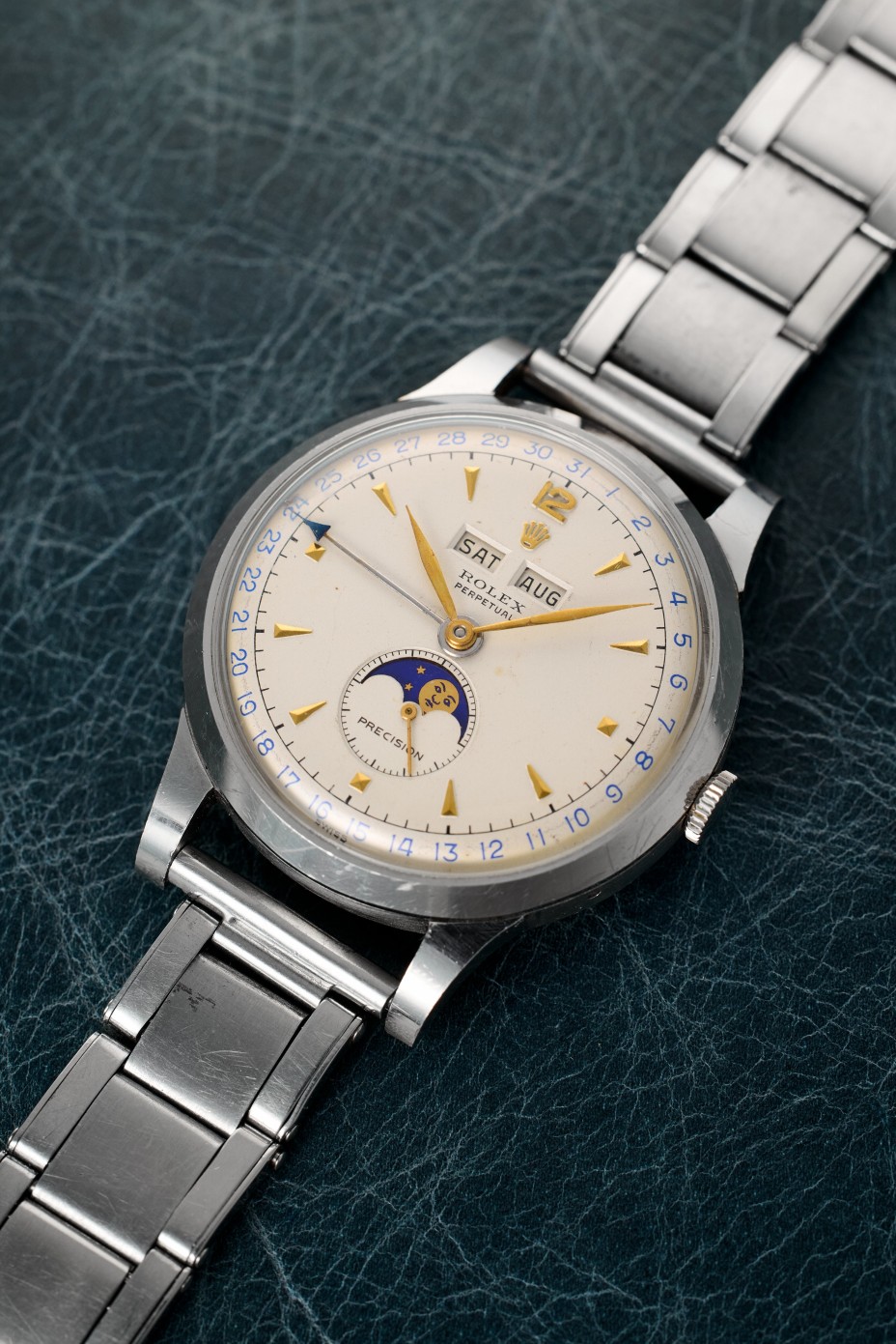 تتميز هذه الساعة بوظائف ثلاثية تشمل التاريخ واليوم والشهر، مع إضافة مرحلة القمر التي تمنحها جاذبية كلاسيكية فريدة. يُعرف هذا النوع من ساعات رولكس بدقته العالية وتصميمه المتقن الذي يمكّن المستخدم من متابعة الوقت والتقويم الفلكي في آن واحد، وهو ما يجعلها محط اهتمام جامعي الساعات الفاخرة حول العالم.