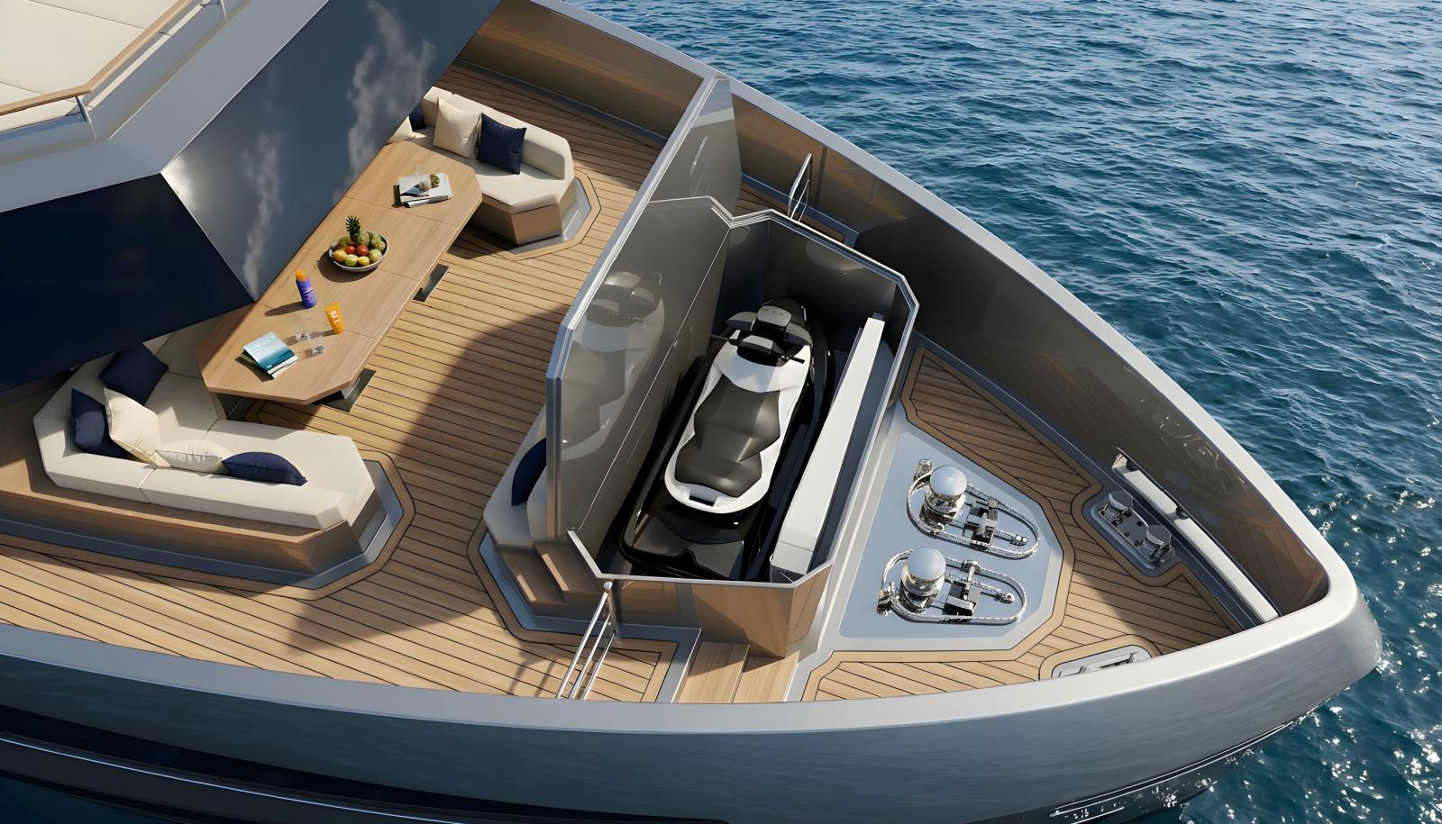 ومن أبرز خصائص التصميم نظام تخزين وتشغيل الألعاب البحرية، إذ يتم تخزين دراجة جت سكي بشكل أنيق داخل صندوق مخصص في المقدمة مزود برافعة خفية لتسهيل الإطلاق، وعند الإغلاق يتحول الغطاء إلى مساحة إضافية للتشمس مزودة بوسائد جلوس مريحة.