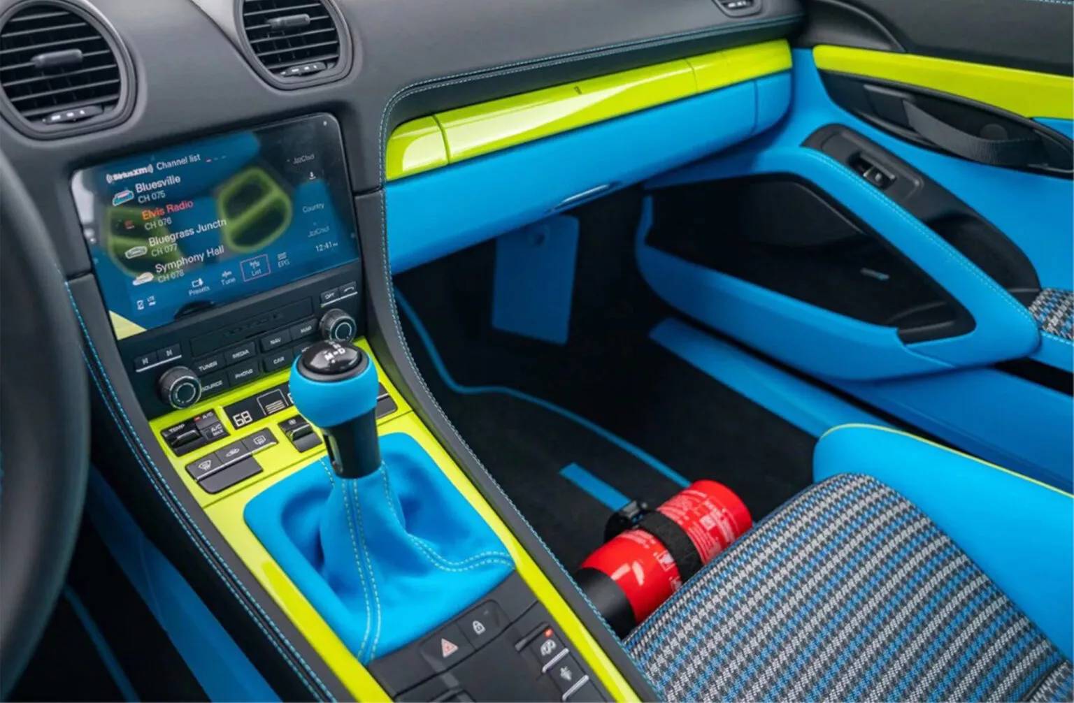 تتميز بورشه GT4 RS بطلاء خارجي أخضر فاقع يُرجح أنه لون Birch Green، وهو لون جريء ينسجم نسبيًا مع الطابع الرياضي المتطرف للسيارة. إلا أن اللافت هو الاعتماد المكثف على اللون الأزرق الفاتح في تفاصيل متعددة، ما خلق تباينًا بصريًا صادمًا.