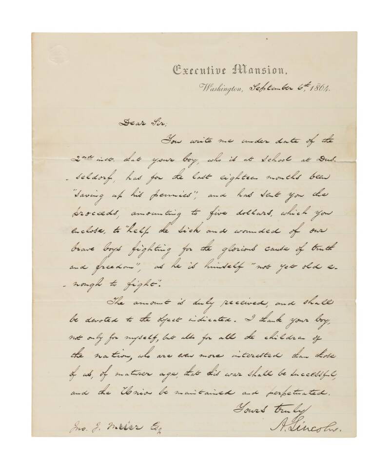 وجّه لينكولن رسالته إلى جون جاي موير (John J. Muir) من بروكلين، شاكرًا ابنه الصغير على تبرعه بمبلغ خمسة دولارات، مدخرات جمعها خلال دراسته في مدينة دوسلدورف (Düsseldorf)، لدعم الجنود الجرحى في جيش الاتحاد.