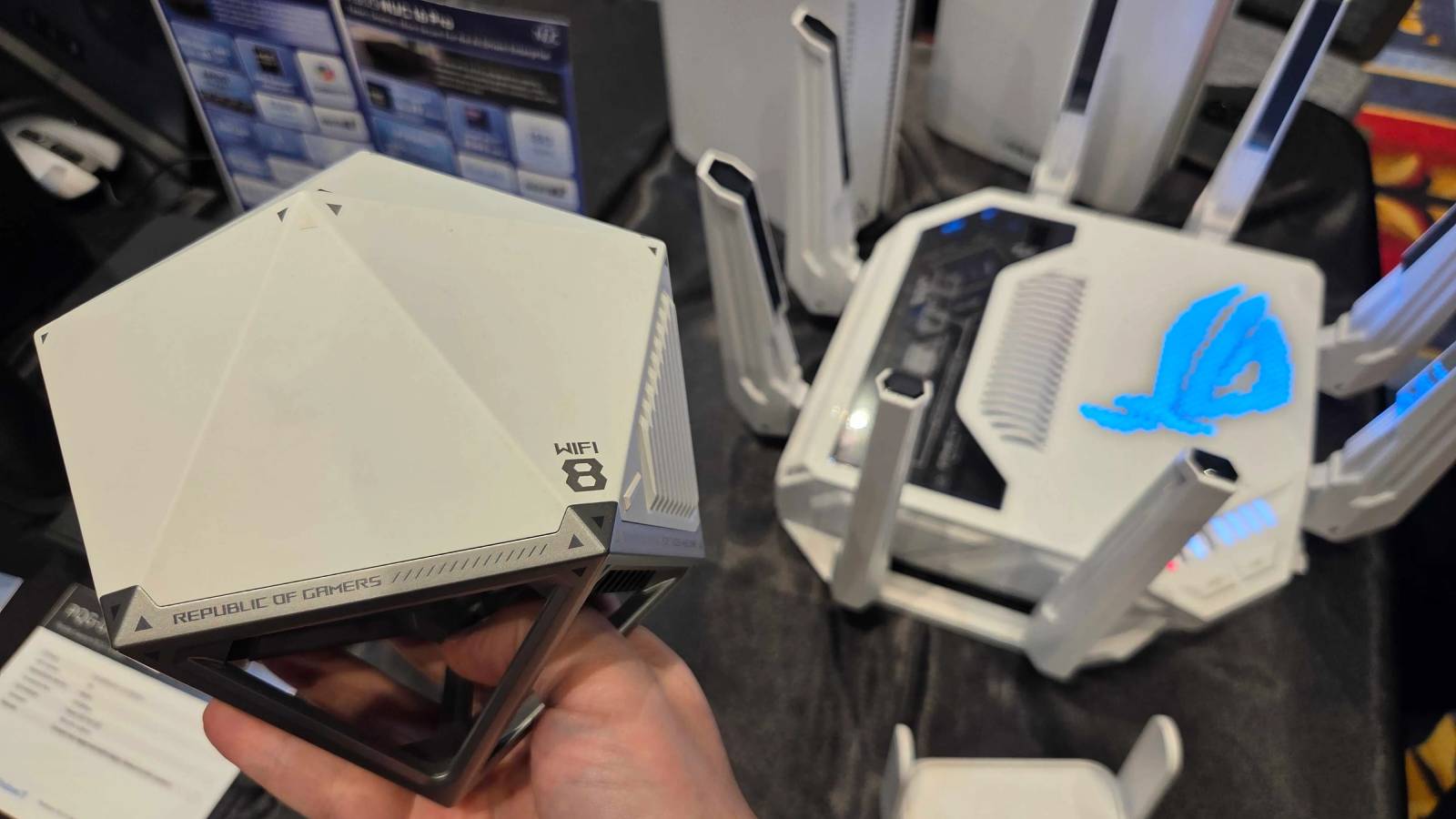 ومن أبرز المفاجآت في CES 2026، استعراض شركة أسوس (Asus) نموذجًا أوليًا لراوتر ROG NeoCore Wi-Fi 8، بتصميم غير تقليدي يخلو تمامًا من الهوائيات الخارجية، ويشبه مجسّمًا متعدد الأضلاع، أقرب إلى نرد ذي 20 وجهًا.
