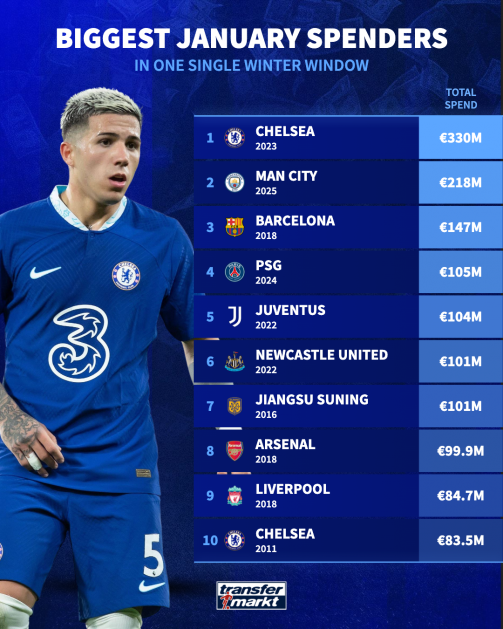 وتبرز إنفاقات تشيلسي في نافذة يناير التاريخية لعام 2023، حيث بلغ إجمالي الإنفاق 330 مليون يورو، مع أبرز الصفقات الدائمة لسبعة لاعبين وإعارة جوآو فيليكس، فيما كان أنزو فرنانديز أغلى صفقاتهم حين انتقل من بنفيكا مقابل 121 مليون يورو، متبوعًا بمايكالو مودريك بـ 70 مليون يورو من شاختار.