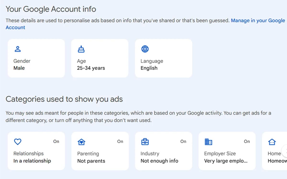 وأوضحت الناشطة أنه عبر البحث عن عبارة "إعدادات إعلانات غوغل" (Ads Settings Google)، يظهر أول رابط قائمة بيانات ضخمة تشمل العمر، الموقع الجغرافي، الحالة الاجتماعية (سواء كان المستخدم عازباً أو في علاقة)، ملكية المنزل، الأبوة، وحتى القطاع المهني الذي يعمل به المستخدم، بالإضافة إلى العلامات التجارية المفضلة، وهي معلومات تُجمع لتخصيص الإعلانات.
