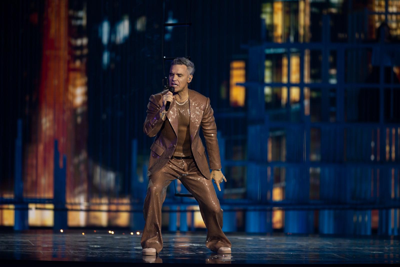 وفي ظهوره الثاني، اختار ويليامز إطلالة مغايرة لفقرته الغنائية على المسرح، حيث اعتمد نمط "المونوكروم" (أحادي اللون) ببدلة بنية مصنوعة من خامة "السيكوين" اللامعة، في خيار جاء متناغماً تماماً مع الأجواء الاستعراضية والحماسية التي قدمها.