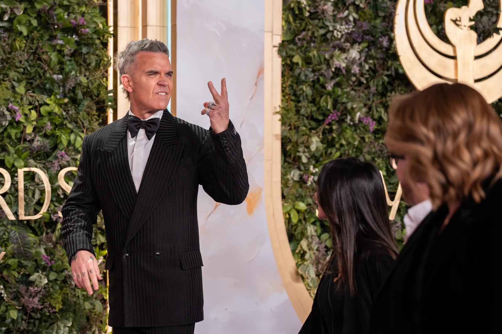 خطف المغني العالمي روبي ويليامز الأنظار في حفل "Joy Awards" باعتماده إطلالتين مختلفتين، حيث أطل على السجادة الخزامية ببدلة كلاسيكية باللون الأسود، تميزت بخطوط طولية سوداء، ونسقها مع قميص أبيض وربطة عنق سوداء.
