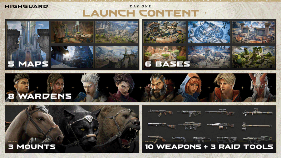 تضم لعبة Highguard عند انطلاقها محتوى غنيًا، يتمثل في 8 أبطال قابلين للعب، يُطلق عليهم اسم "واردنز"، مدعومين بـ10 أسلحة متنوعة و3 أدوات للغارات.
