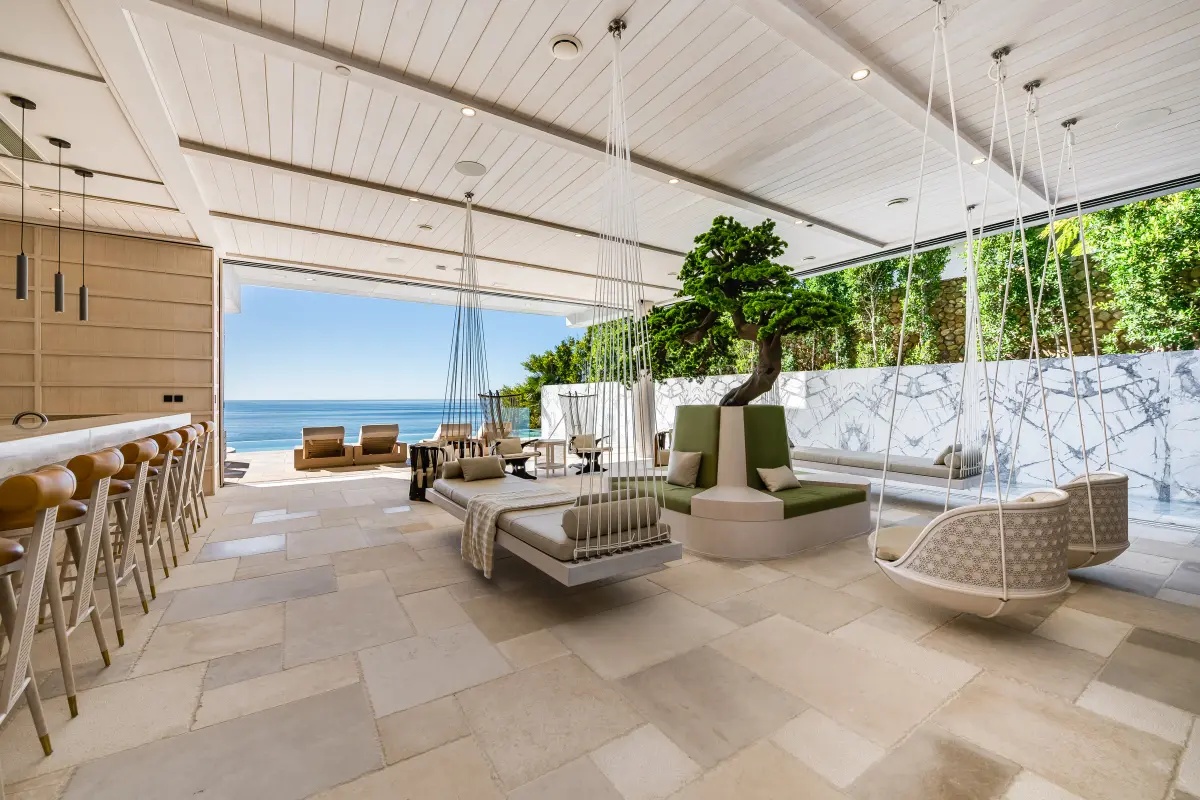 ومن أبرز معالم القصر مسبح متعدد المستويات بطول 176 قدماً مع نافذة تحت الماء تطل على المحيط، ما يمنح القصر طابعاً فريداً يجمع بين الفخامة والابتكار.
