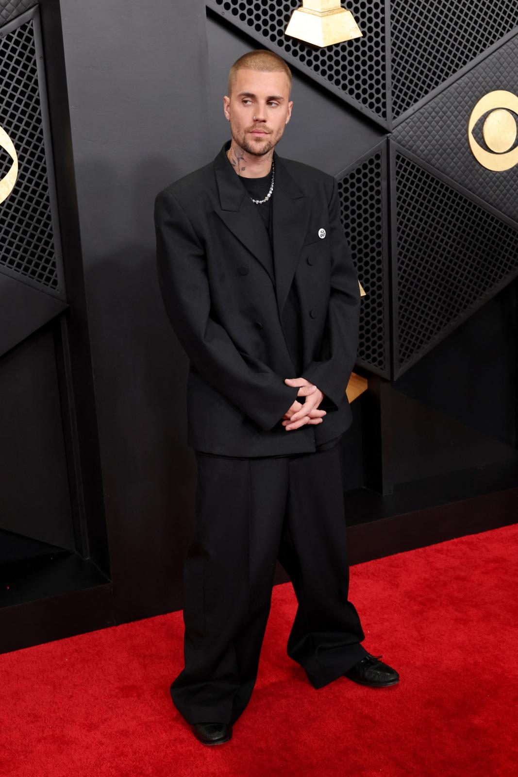 لم يلجأ جيستن بيبر للبدل الكلاسيكية بالطبع، بل لجأ للأسلوب العصري في اختيار البدل، واختار واحدة بتصميم Oversize واسعة للغاية سواء في السترة ذات صفي الأزرار أو السروال من تصميم دار بالنسياغا Balenciaga، ونسقها مع T-Shirt أسود وسلسلة من الذهب الأبيض.