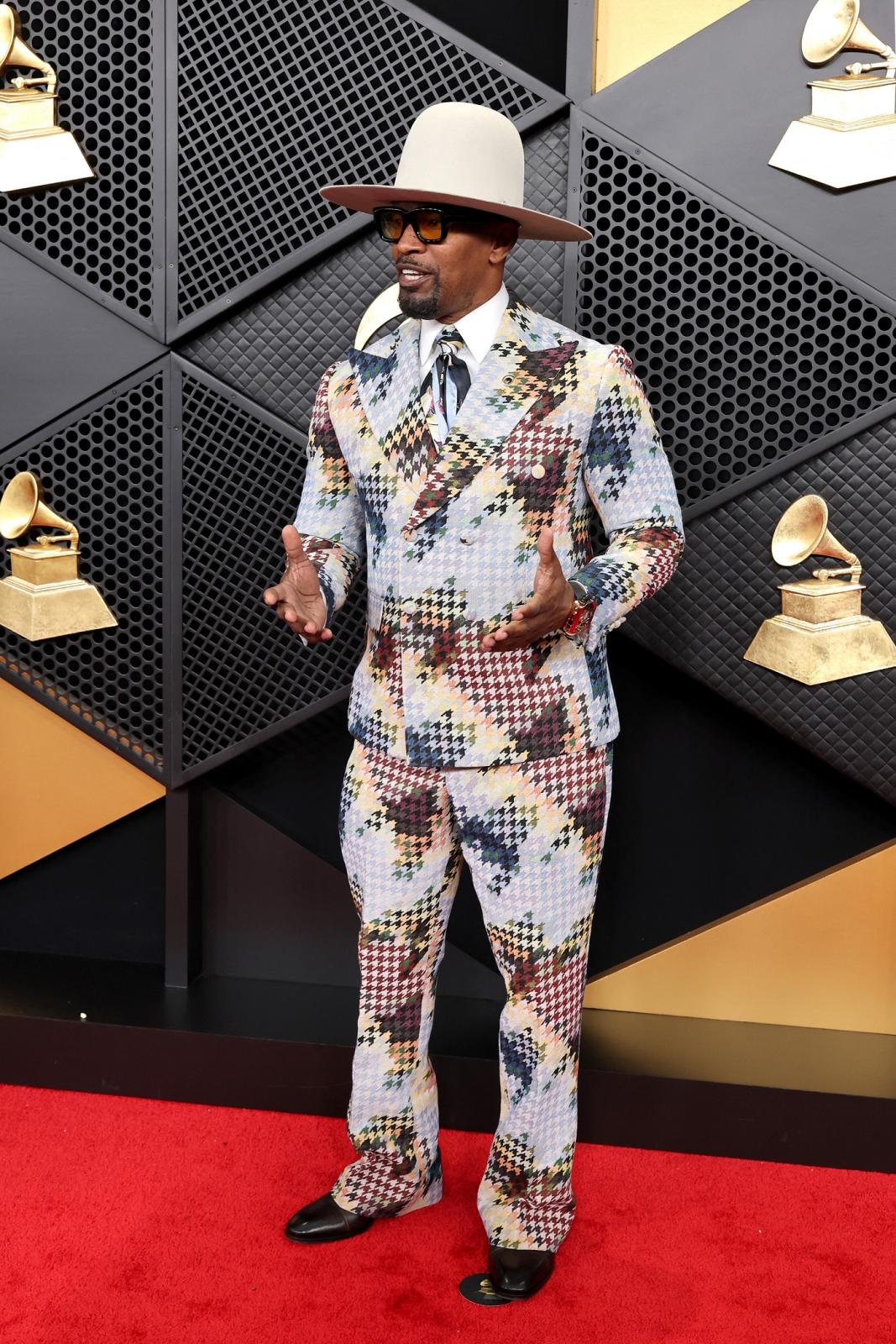 وصل الموسيقي جيمي فوكس لحفل غرامي مرتدياً بدلة بنقشة مربعات صغيرة بألوان متدرجة من البيج والبني والأزرق والبرتقالي والأصفر والعنابي وغيرها، كما ارتدى قبعةً عاليةً كبيرةً ذات حافة دائرية عريضة.