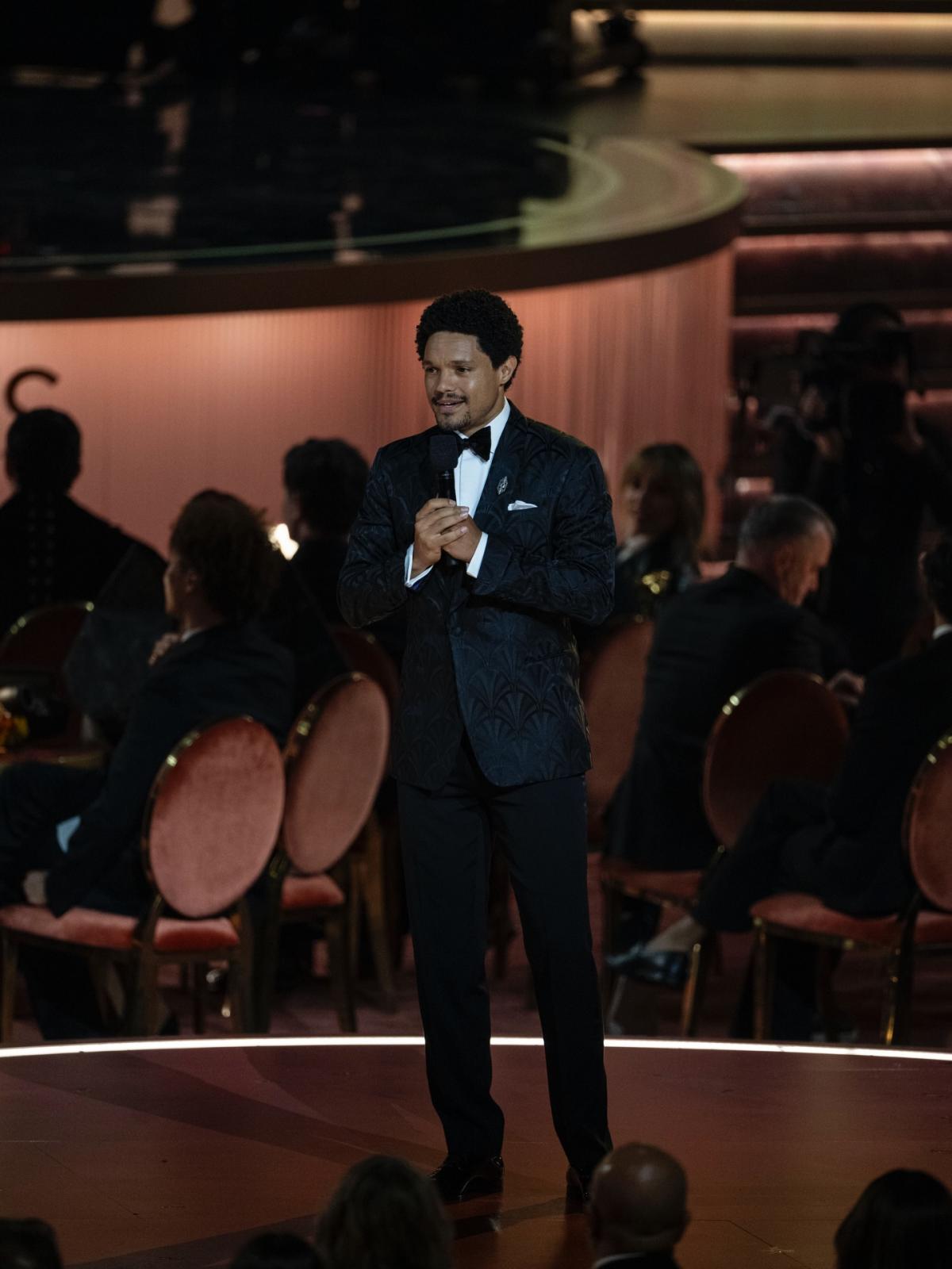 اختار تريفور نواه بدلة أنيقة من تصميم رالف لورين: جاءت السترة من خامة الجاكارد مع سروال رسمي، وقد نسقهما مع قميص أبيض وربطة عنق أنيقة.