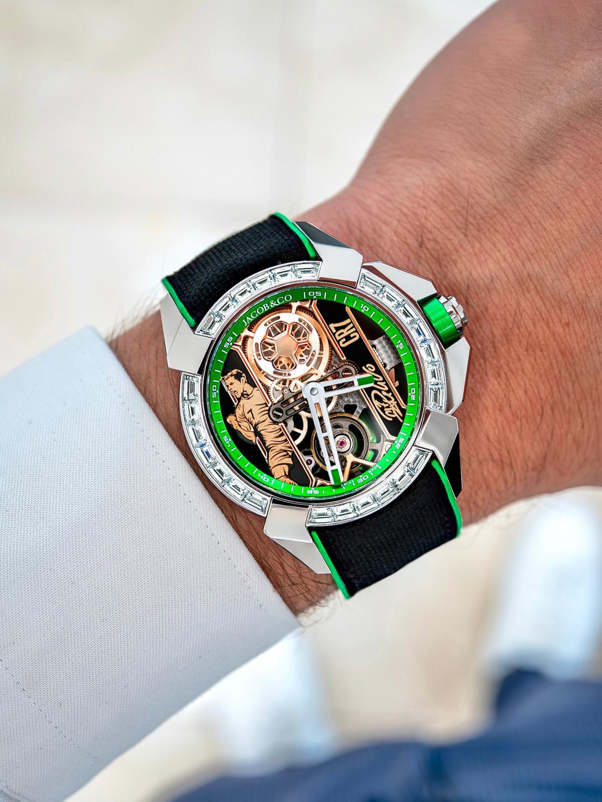 أقدم كريستيانو رونالدو على تجربة مميزة بتقديم ساعة أنيقة بالتعاون مع جاكوب أند كو Jacob & Co: إنها ساعة Jacob & Co Epic X Heart of CR7 Baguette بلونها الأخضر الذي يعكس حماس كريستيانو رونالدو وشدته وحبه لملعب كرة القدم وتم تجسيده من خلال لون جريء، وألماسات، وقلب هيكلي في جوهره.