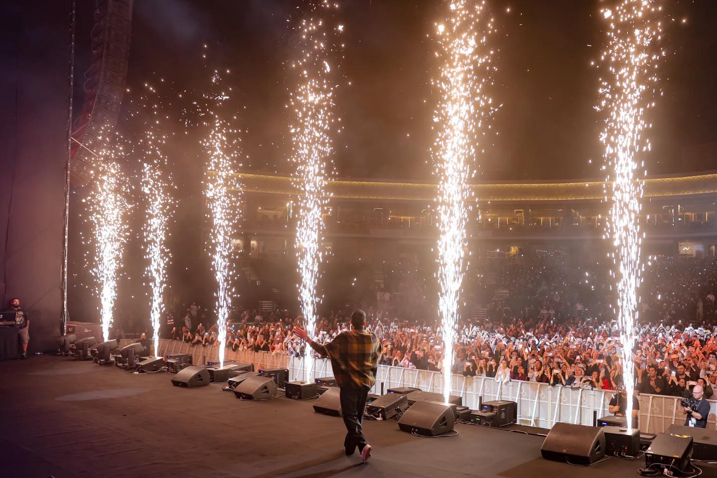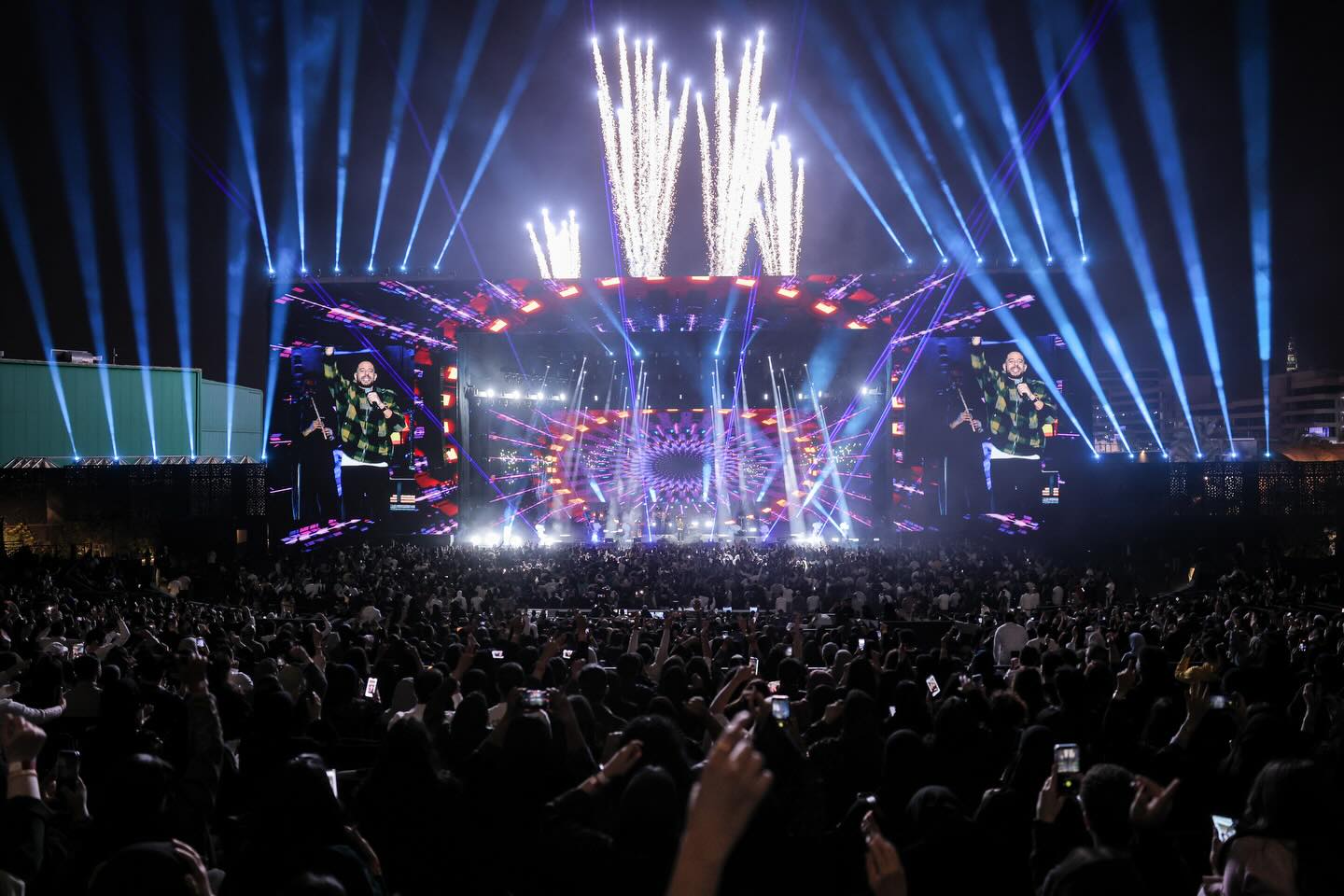ومع ظهور محمد حماقي على المسرح، ارتفعت الصيحات، ليقدم مجموعة كبيرة من أبرز أغانيه وسط تفاعل الجمهور، وعروض ألعاب نارية ضخمة أضاءت سماء المسرح في لحظات الذروة.