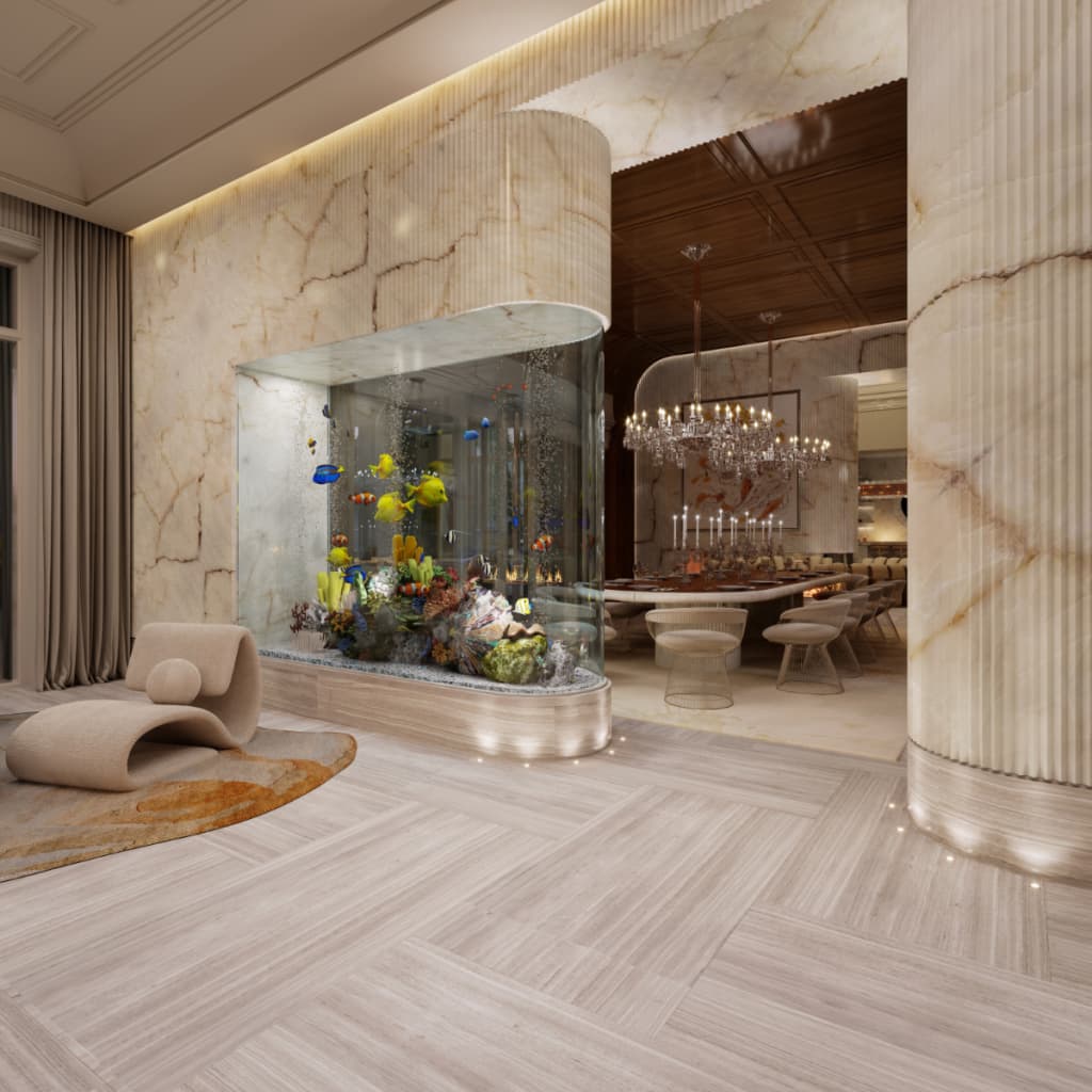 وتتضمن المخططات الداخلية للقصر مرافق ترفيهية غير مسبوقة، منها صالة "جاز" خاصة، ومكتبة بارتفاع مزدوج مخبأة خلف ممر سري، بالإضافة إلى حوض أسماك بسعة 1500 غالون يفصل بين منطقة المطبخ وتناول الطعام، وجناح "سبا" مجهز بغرفة ساونا بجدار من ملح جبال الهيمالايا.