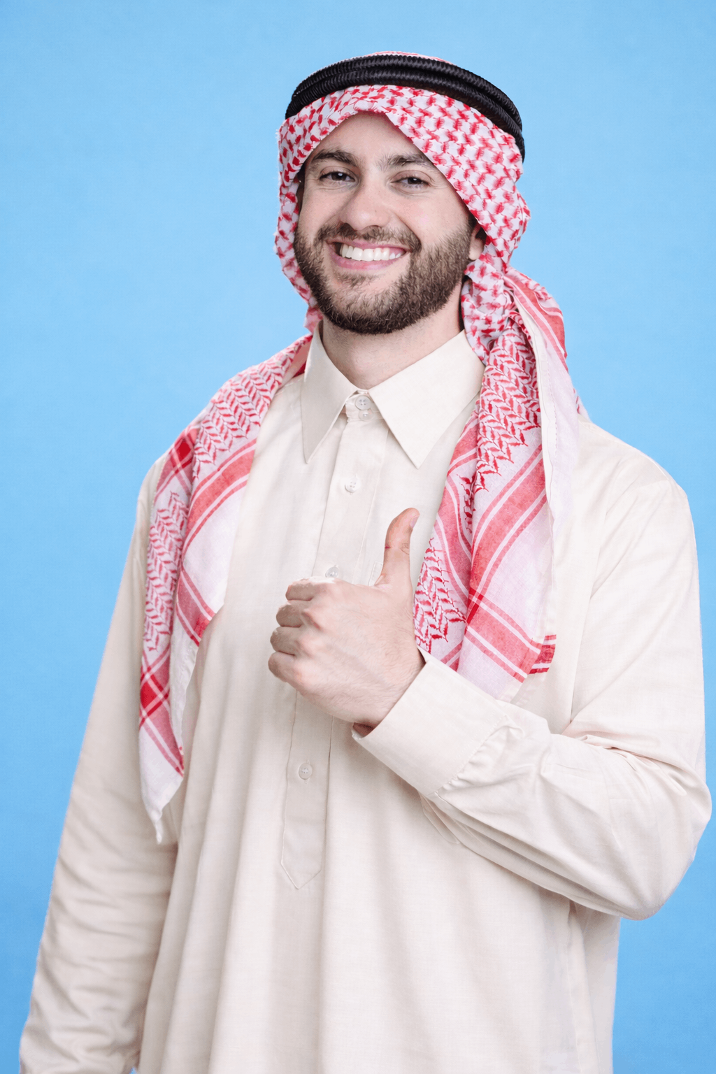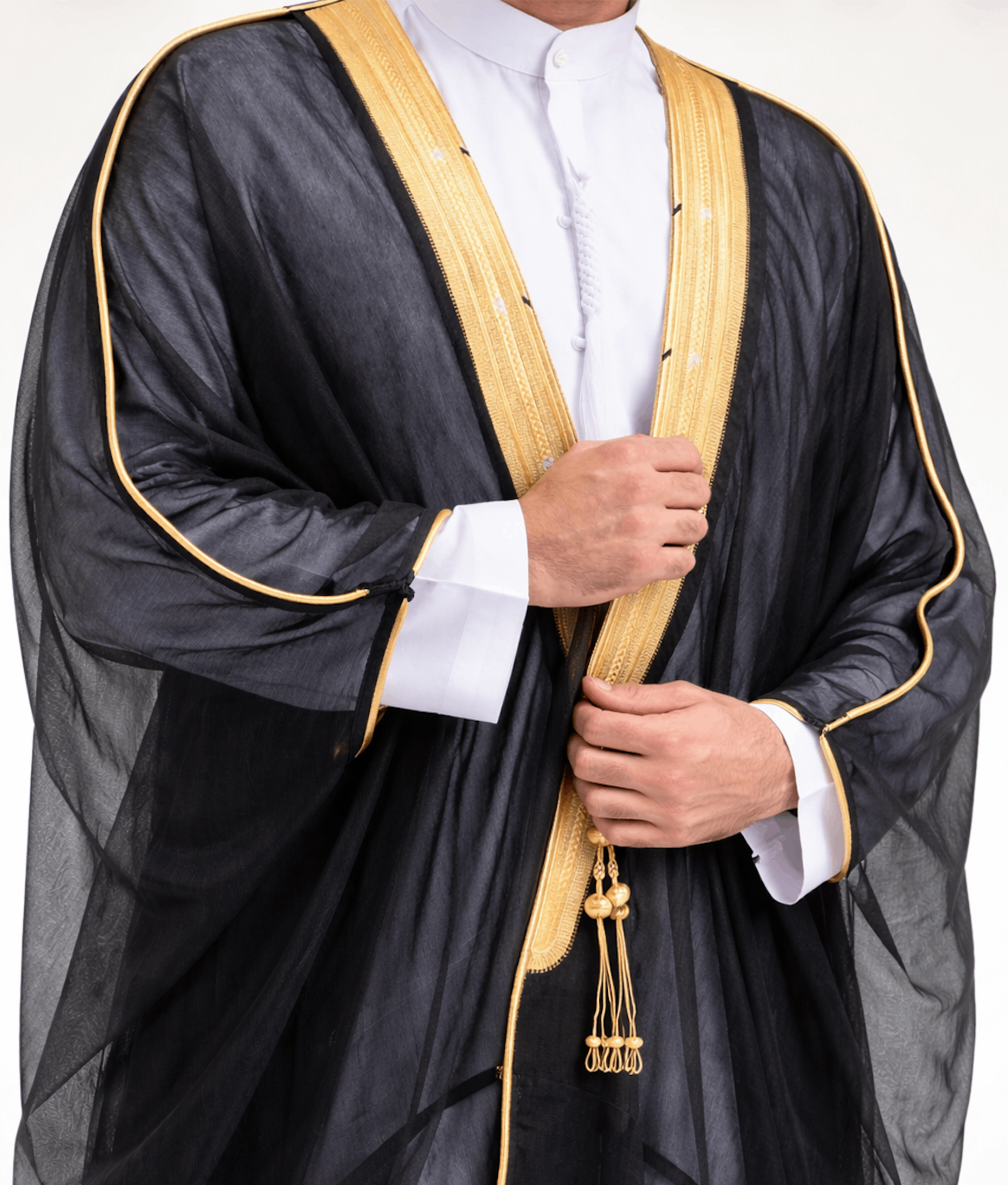 الأبيض الناصع (Bright White) يمنح وضوحًا حادًا وانطباعًا رسميًا قويًا، خصوصًا في الإضاءة النهارية المباشرة. يعكس الضوء بوضوح، ويخلق تباينًا أنيقًا مع البشت الداكن. هو خيار نهاري بامتياز، خصوصًا في الإضاءة الطبيعية المباشرة، لكنه قد يبدو قاسيًا إذا كان القماش خفيفًا جدًا أو إذا كانت الإضاءة شديدة.