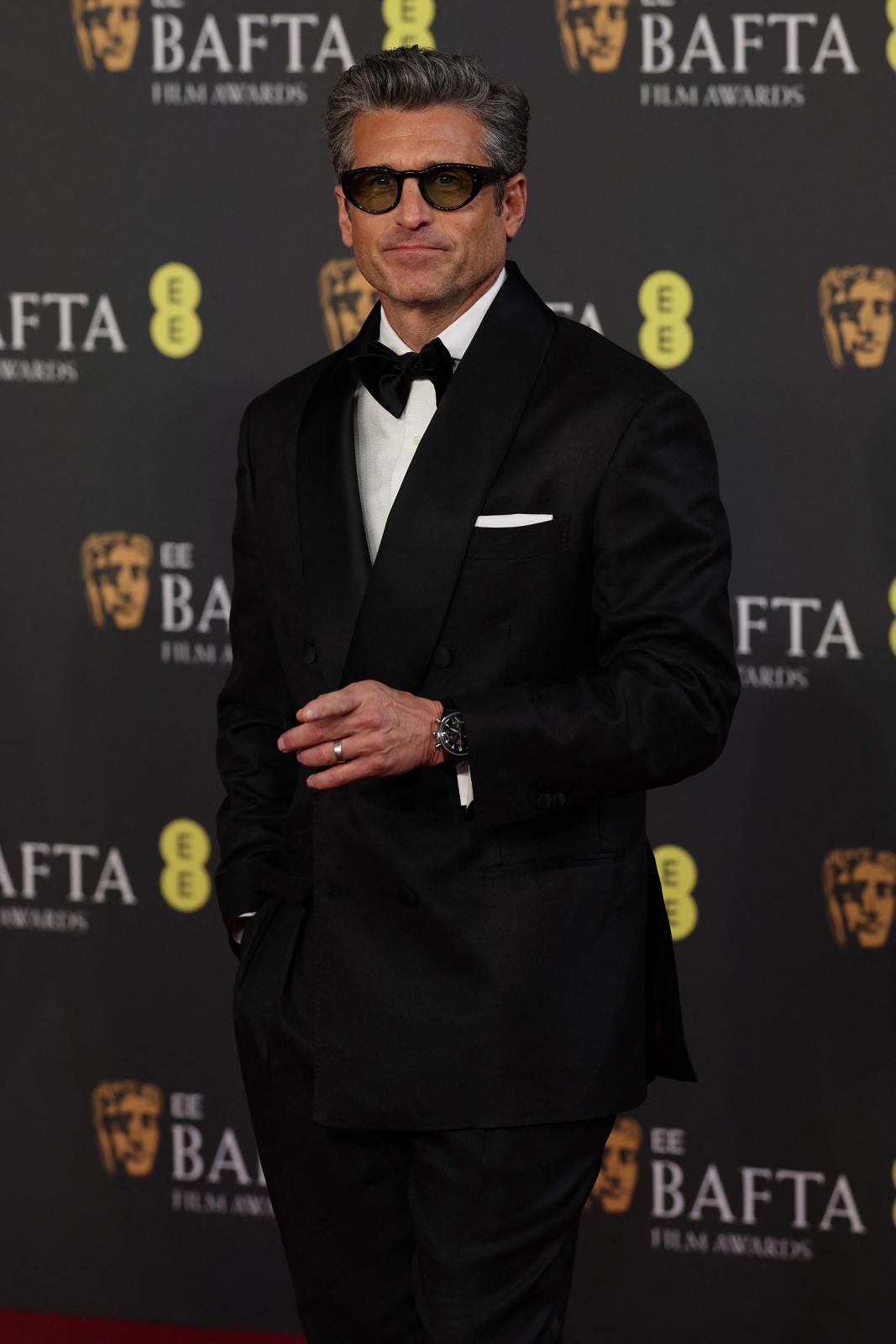 اختار باتريك ديمبسي بدلة توكسيدو مزدوجة الصدر باللون الأسود من Brunello Cucinelli، ونسّقها مع قميص أبيض وربطة عنق سوداء، وأكمل الإطلالة بساعة Carrera Chronograph Tourbillon من TAG Heuer، في مزيج يجمع بين الرسمية والطابع الرياضي الفاخر.