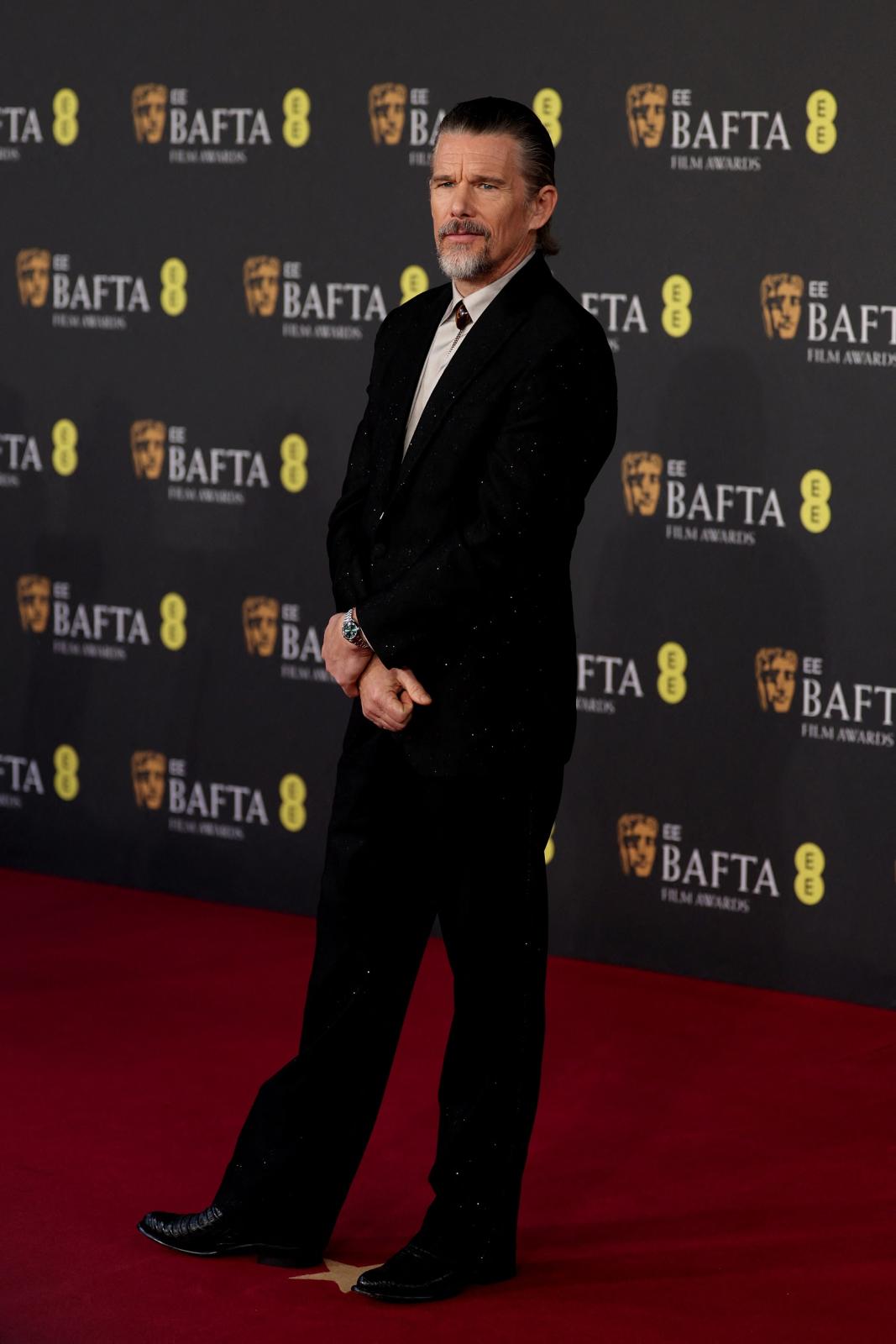 جاءت إطلالة إيثان هاوك في حفل توزيع جوائز BAFTA ببدلة لامعة بلمسة مستوحاة من طابع الغرب الأميركي، مستبدلًا ربطة العنق بإكسسوار ذهبي أنيق عند الياقة مع قميص كريمي اللون، واختار ساعة Seamaster Aqua Terra من دار Omega.