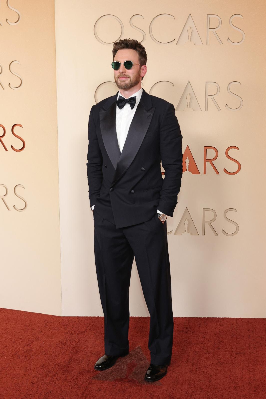 جاءت إطلالة كريس إيفانز Chris Evans لافتة ببدلة توكسيدو مزدوجة الصدر من تصميم Giorgio Armani.