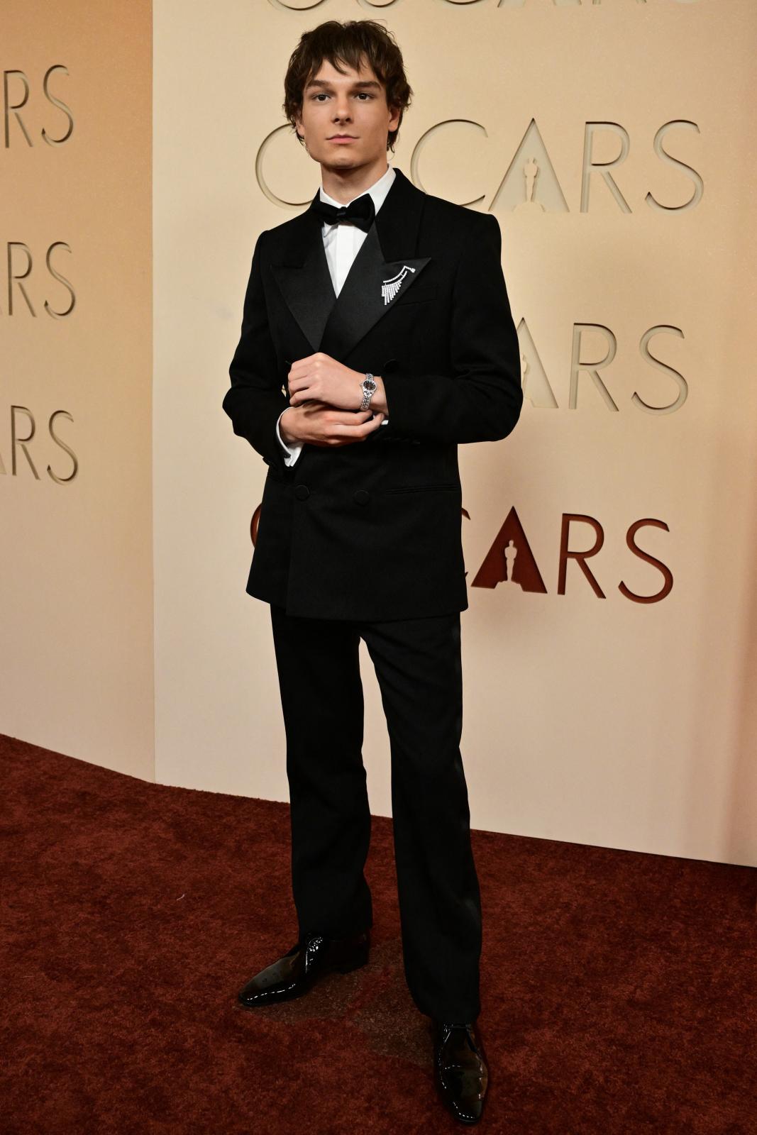 اختار الممثل الشاب مايسون ثايمز Mason Thames بدلة توكسيدو كلاسيكية بروح عصرية من تصميم Saint Laurent. ونسقها مع دبوس ماسي من جواهر Garatti، بينما ترك شعره بتصفيفة طبيعية أضفت على الإطلالة طابعًا شبابيًا لافتًا.