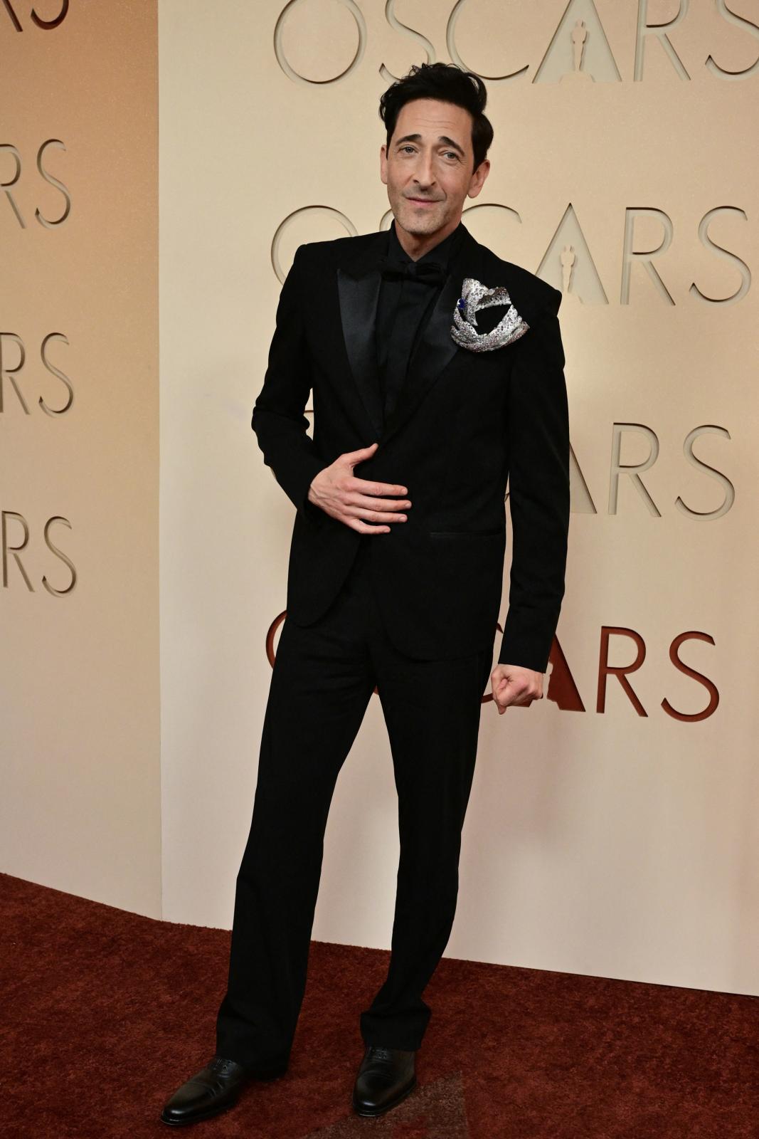 ونسق برودي الإطلالة مع دبوس ماسي كبير على صدر السترة، ما أضاف لمسة فاخرة كسرت صرامة اللون الأسود بالكامل.