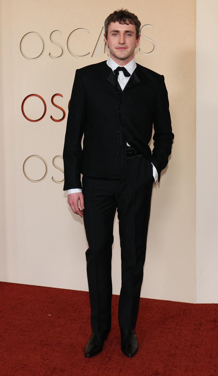 اختار بول ميسكال Paul Mescal بدلة أنيقة من تصميم Celine تميل إلى الطابع الرومانسي، حيث جاءت السترة بتصميم مختلف يشبه الكارديغان مع ياقة دائرية وربطة عنق رفيعة.