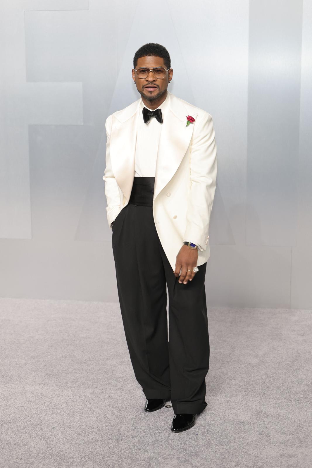 استلهم آشر Usher أناقته من أسلوب هوليوود الكلاسيكي، مرتديًا سترة بيضاء واسعة مع سروال أسود وربطة عنق سوداء من تصميم جوليفا هيريتدج Giuliva Heritage.