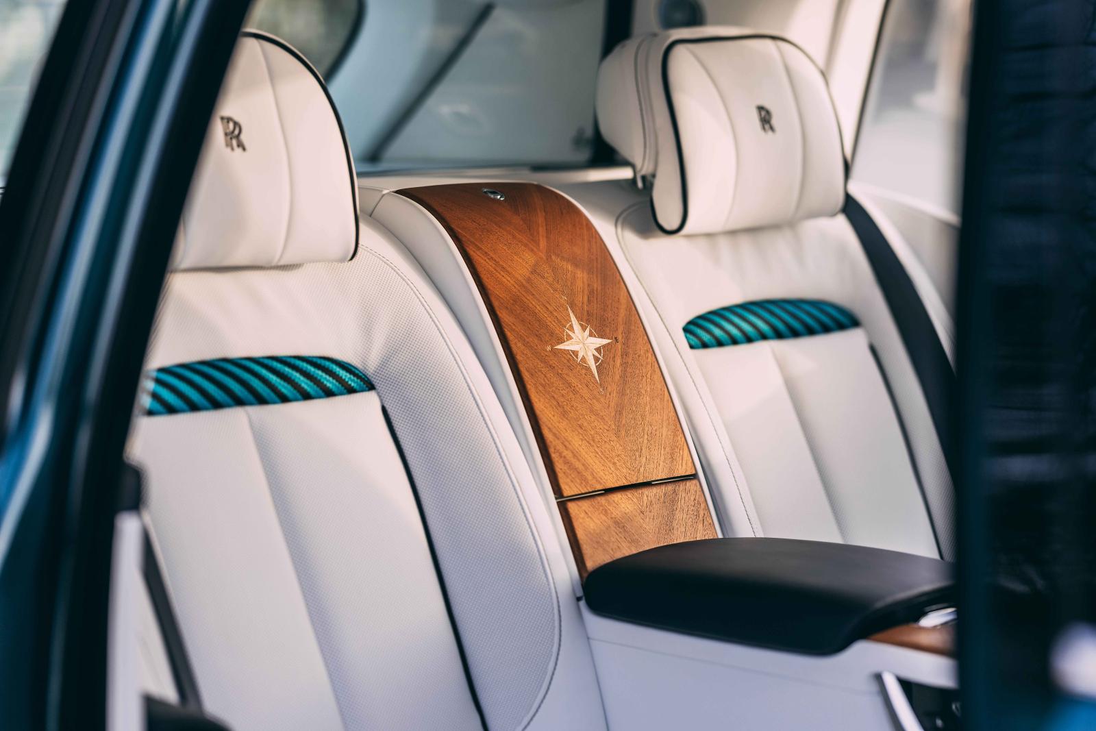 ومن الألوان إلى المقاعد، ينتقل التصميم إلى مستوى آخر يعتمد على نمط مستوحى من حبال الإبحار. نُفّذ هذا النمط يدويًا بخطوط مائلة باستخدام خيوط رولز‑رويس المخصوصة، وابتكره حرفي يمتلك خبرة عميقة في تقنيات البحرية الملكية. وبفضل هذه الخلفية، تحوّل أسلوب لفّ الحبال البحرية إلى تصميم مُحكم يوازن بين الجانب الجمالي والمتانة.