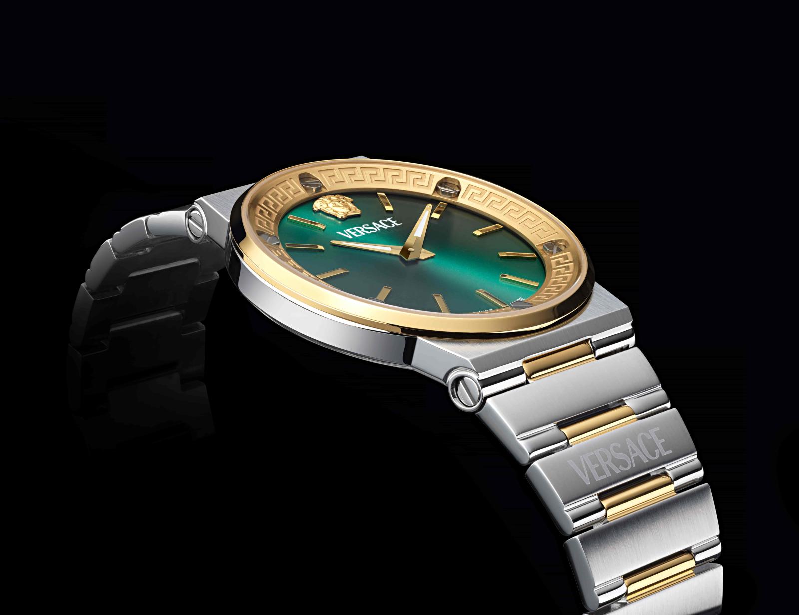 يتحقق في تصميم هذه الساعة معنى الخفّة المترفة كما معنى الأناقة الصارمة، إذ تستوطن علبة مشغولة من الفولاذ بقطر 38 ملليمترًا، مع قرص مائل مصقول بالذهب الأصفر ويزهو بزخارف غريكا، وميناء أخضر اللون يزدان بزخارف على نمط أشعة الشمس ويحتضن مثل الإصدار السالف شعار دار فيرزاتشي ورأس ميدوسا عند مؤشر الساعة 12.