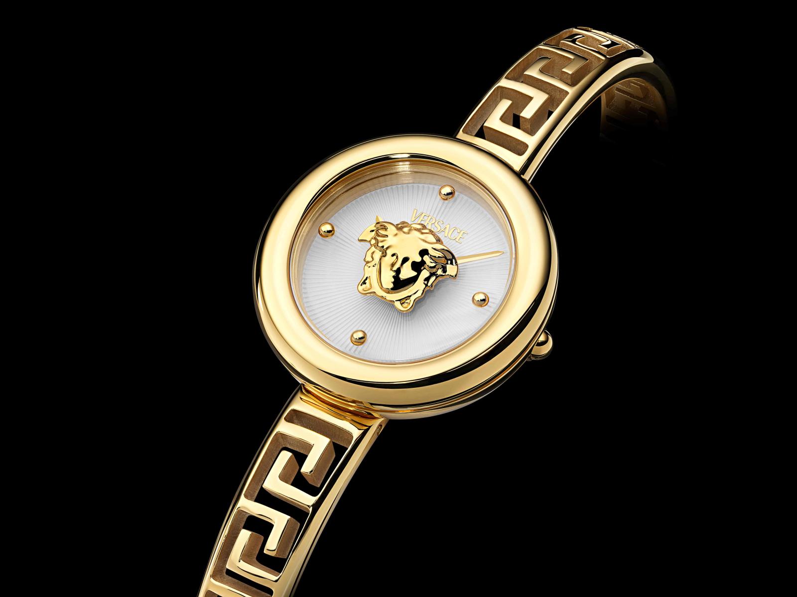 يبرز رمز ميدوسا ثلاثي الأبعاد في قلب الميناء، الذي يطابق لونه لون العلبة التي يبلغ قطرها 34 ملليمترًا، وتنبثق أسفله عقارب تشير إلى حلقة الساعات المنحوتة على هيئة زخارف غريكا، وتُلاحظ هذه الزخارف كذلك على حلقات السوار.