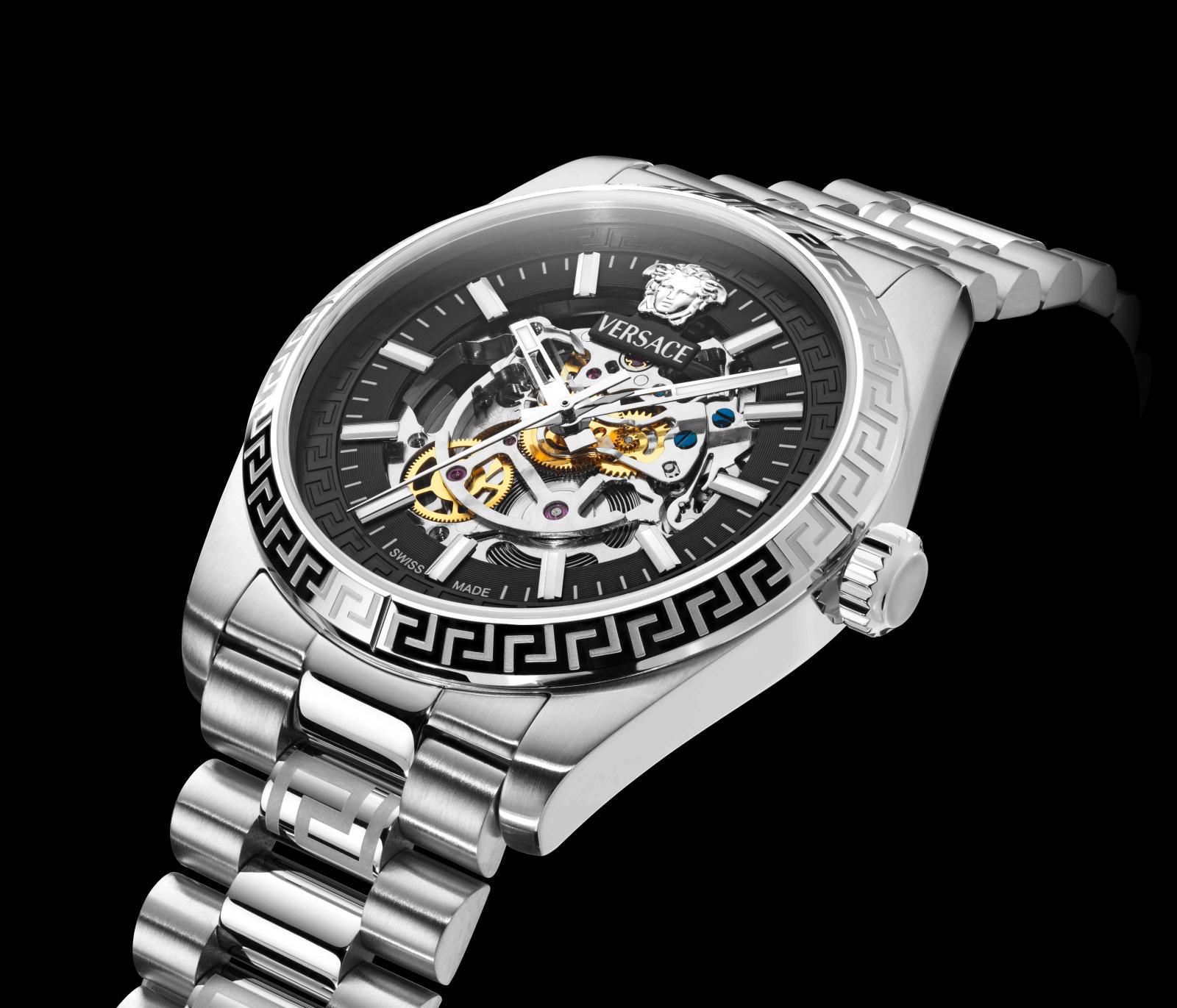 تُجسد هذه الساعة أرفع معاني الكلاسيكية العصرية المقترنة بالأداء العالي، إذ تنطوي علبتها المشغولة من الفولاذ المقاوم للصدأ، بقطر 40 ملليمترًا، على ميناء هيكلي أسود اللون، تُترجم عليه الحركة المستمرة إلى فعل جمالي مطبوع بالدقة السويسرية التي لا تشوبها شائبة. إلى جانب التصميم الهيكلي، يتمايز الميناء كذلك برمز ميدوسا عند مؤشر الساعة 12 وزخارف غريكا التي تبرز على الحلقة المحيطة به كما على القرص.