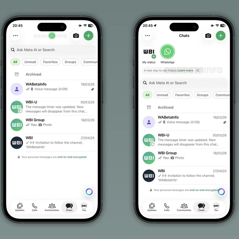 رصدت واتساب ميزةً جديدة قيد الاختبار على الإصدار التجريبي لنظامَي أندرويد وiOS، تُظهر تحديثات الحالة في أعلى تبويب المحادثات مباشرةً، بدلاً من إلزام المستخدم بالانتقال إلى تبويب "التحديثات" في كل مرة يريد الاطلاع على ما نشرته جهات اتصاله.