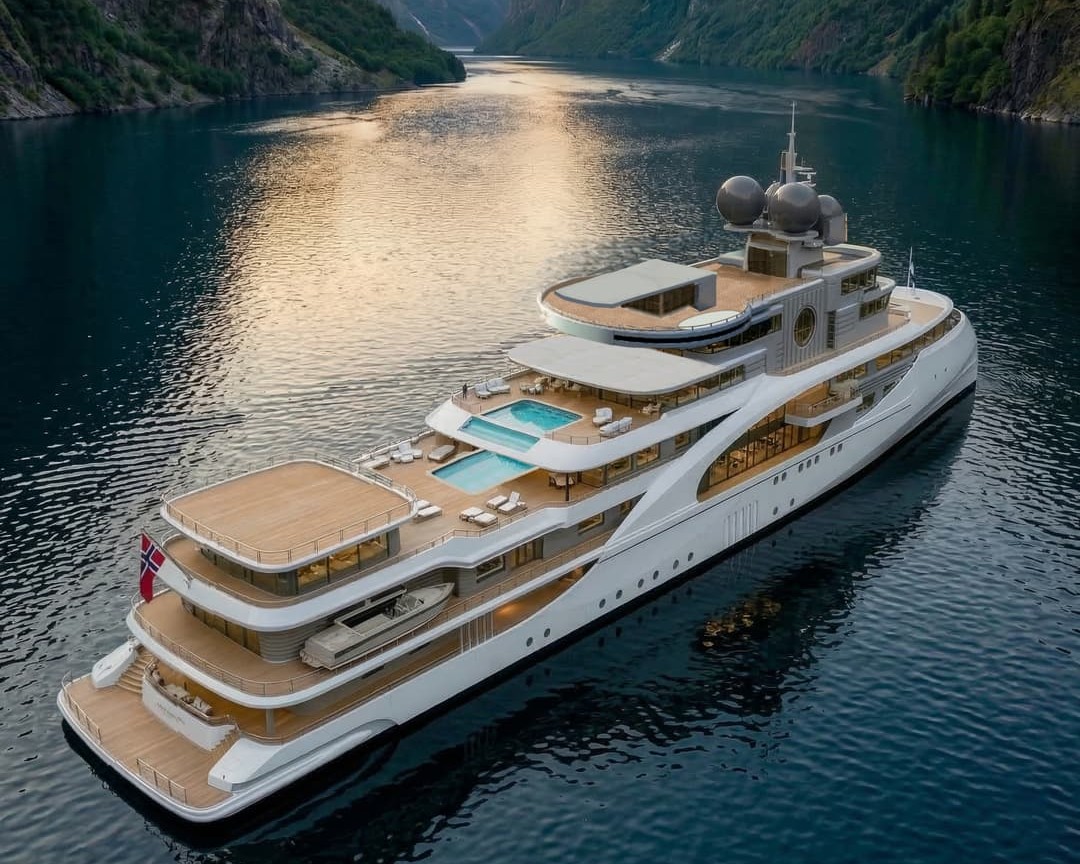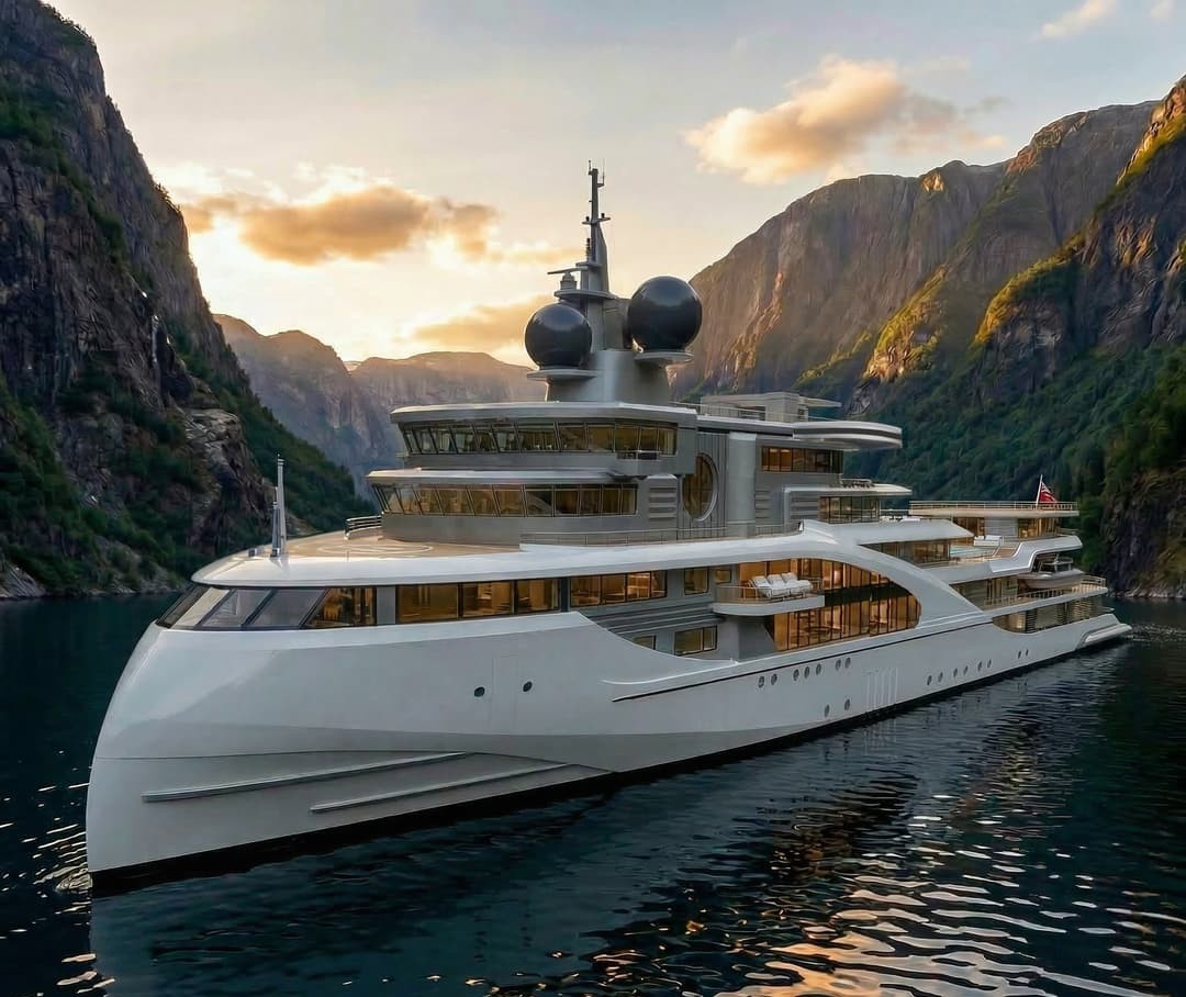 ويبرز اليخت كتحفة هندسية تعتمد على العمارة المرنة والمساحات المتدرجة، مع هيكل خارجي يجمع بين الخطوط الانسيابية والأسطح متعددة الطبقات التي تمنح إيحاءً بصريًا بأن الأجزاء العلوية تطفو فوق الهيكل الرئيس.