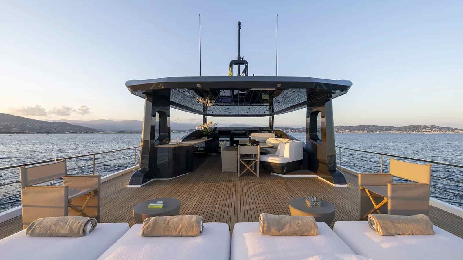 يمتد السطح العلوي على معظم طول اليخت، ويوفر مجموعة من المساحات المتعددة الاستخدامات. ففي الخلف توجد أسرّة شمسية واسعة، بينما يضم الجزء الأوسط منطقة شواء وطاولة خدمة تحت السقف الصلب، إلى جانب مساحة لتناول الطعام في الهواء الطلق.