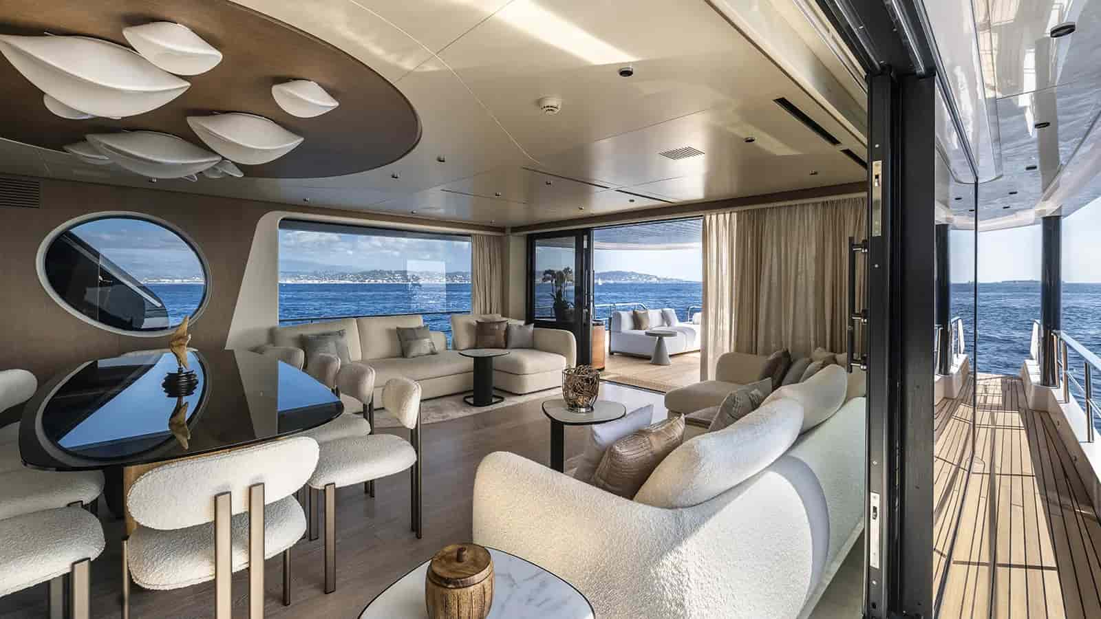 يبتعد التصميم الداخلي لليخت عن الزوايا الحادة والخطوط الصارمة، ويعتمد بدلاً من ذلك على منحنيات ناعمة تمنح المساحات إحساسًا بالهدوء والانسيابية. وتنسجم لوحة الألوان التي تجمع بين الأبيض والبيج والبرتقالي الدافئ والبني مع استخدام خشب البلوط في معظم عناصر الديكور.