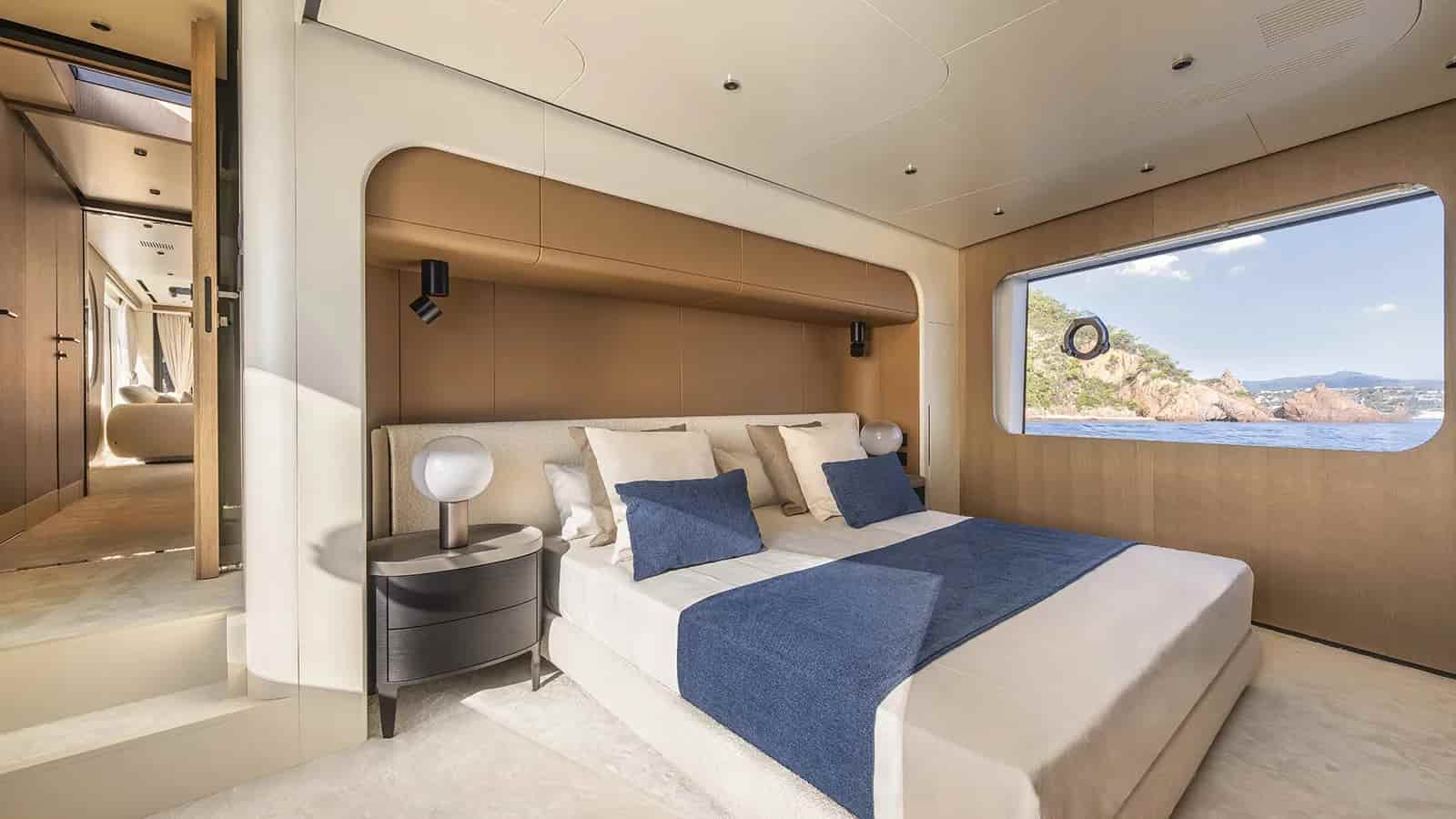 في مقدمة اليخت يقع جناح المالك الممتد بعرض الهيكل بالكامل، مستفيدًا من النوافذ الكبيرة التي توفر إضاءة طبيعية وإطلالات بانورامية على البحر. ويضم الطابق السفلي أربع مقصورات إضافية للضيوف، ما يسمح باستضافة عدد مريح من الزوار خلال الرحلات الطويلة.