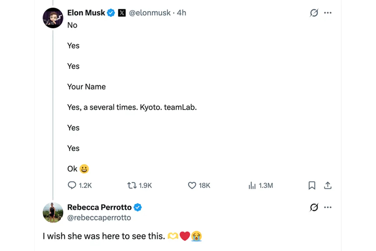وبعد أيام من وفاتها، بادر إيلون ماسك بالإجابة عن تلك الأسئلة واحدًا تلو الآخر، في لفتة إنسانية لاقت تفاعلًا واسعًا، وفقًا لما نشره موقع"nypost".
