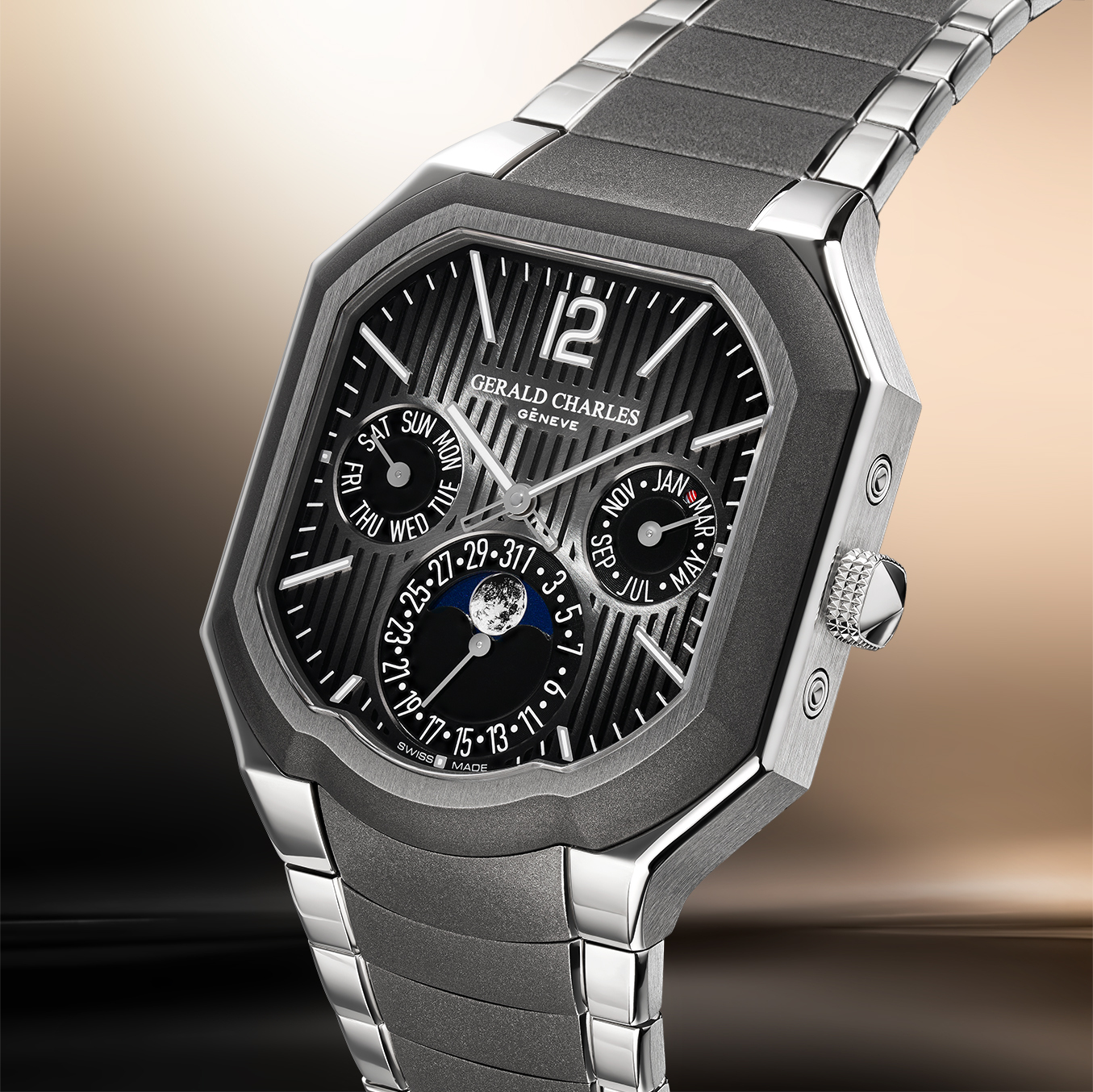 تُقارب دار جيرالد تشارلز Gerald Charles الزمن من منظور فني، تكون الأهمية فيه للبراعة التقنية بقدر ما تكون للتصميم المبتكر، لذلك اتخذ تفسيرها لتعقيد التقويم الدائم هيئة ساعة تجمع بين العمق والتناظر والوضوح. يتجلى هذا عبر الميناء ثنائي البنية، الذي يزهو بزخارف عمودية على نمط أشعة الشمس ويتدرج عليه لون الأنثراسيت بصيغة داكنة باتجاه حواف الميناء.